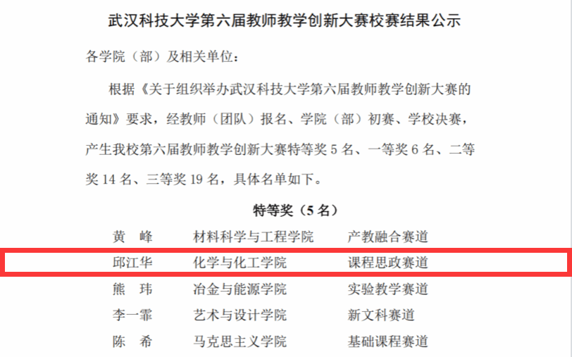 喜报|化工学院邱江华老师在我校第六届教师教学创新大赛中获课程思政赛道特等奖